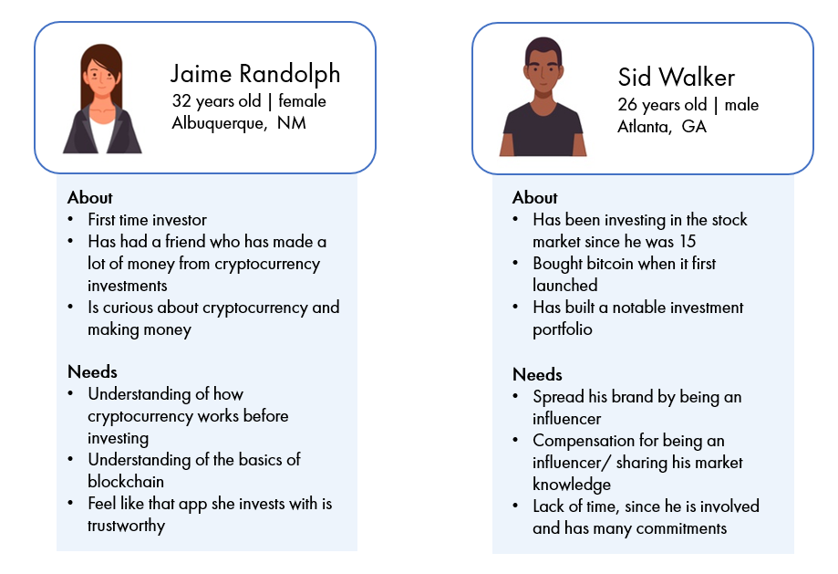 Based off my research, I created two protopersonas to reflect the users of Koinstreet. These are the users that would validate branding choices, to ensure that the landing page is effective.