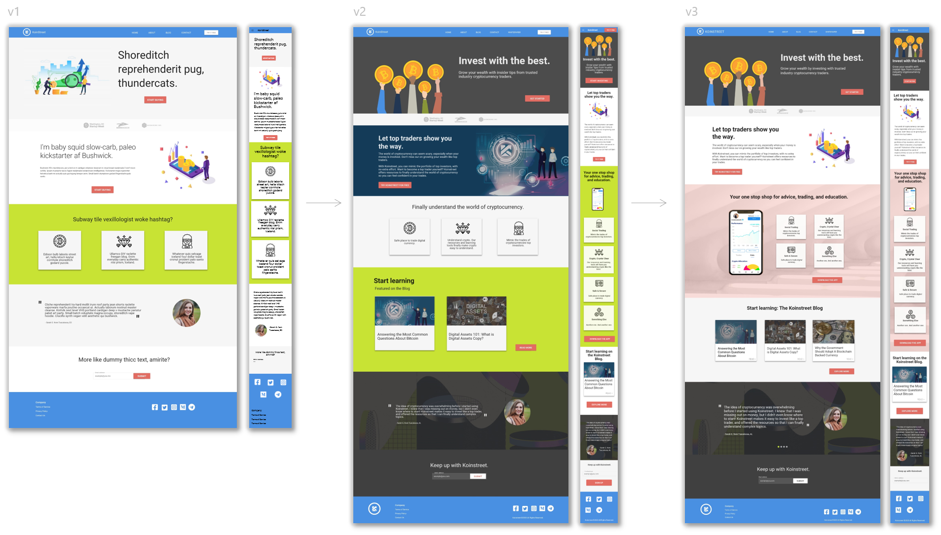 Moving to the development of visual identity for Koinstreet, it was important to keep their main branding elements the same: namely the blue color as well as the Koinstreet logo.