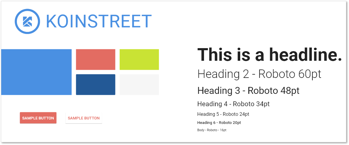 Keeping with the Koinstreet blue, I chose triad color palette reflects a trustworthy, yet fun product. I included a green color that is often associate with finance apps, but in a more vibrant and fun value.Overall, I really wanted the page to be seen as "unpretentious", later incorporating the use of illustrations to aid in all users feeling included. For type, I kept it pretty standard by using different type faces of Roboto for all headings, as well as body text.