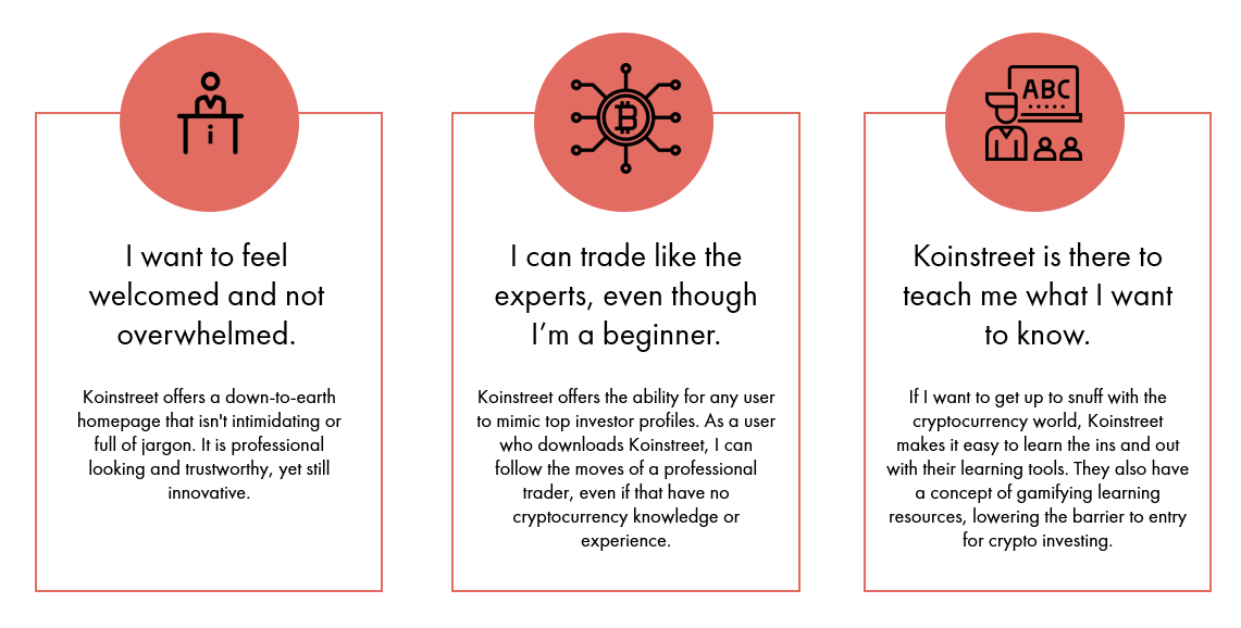 Now understand the competitive landscape, it was clear that Koinstreet needed to differentiate themselves to find a place in the market. This allowed me to see that Koinstreet is a place for beginners to trade like experts. This is reflected in the following key features: