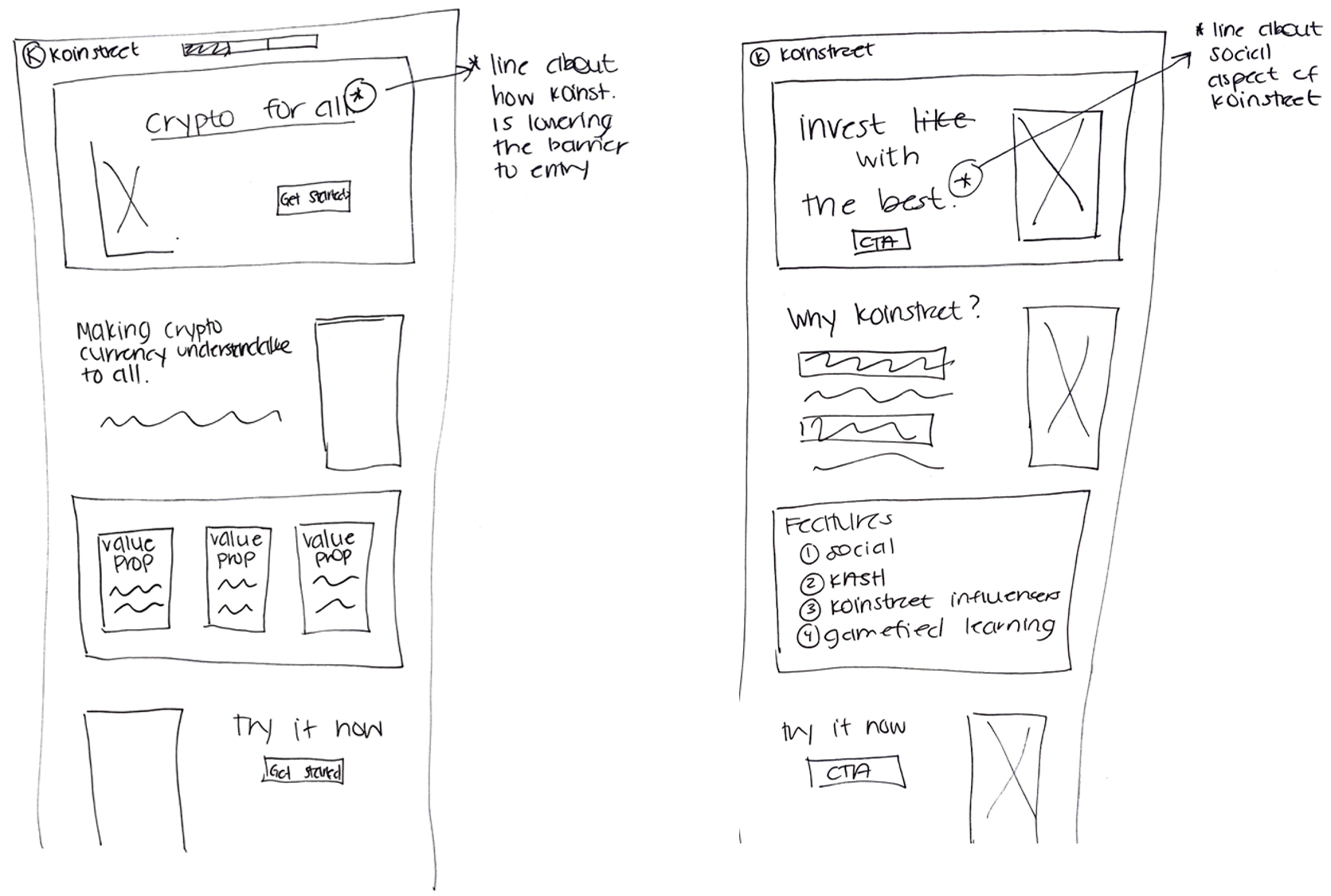 Koinstreet is providing cryptocurrency access to all. They are bridging the knowledge gap needed to invest in cryptocurrency with their mobile app. The company needs an engaging landing page that well articulates it's value, and differentiation from comparable services.