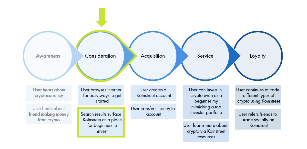 It’s important to remember where the user is in their journey not just with Koinstreet, but with cryptocurrency all up. The user is still in the consideration part of their journey, so it is important to clearly communicate the product's value.