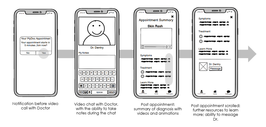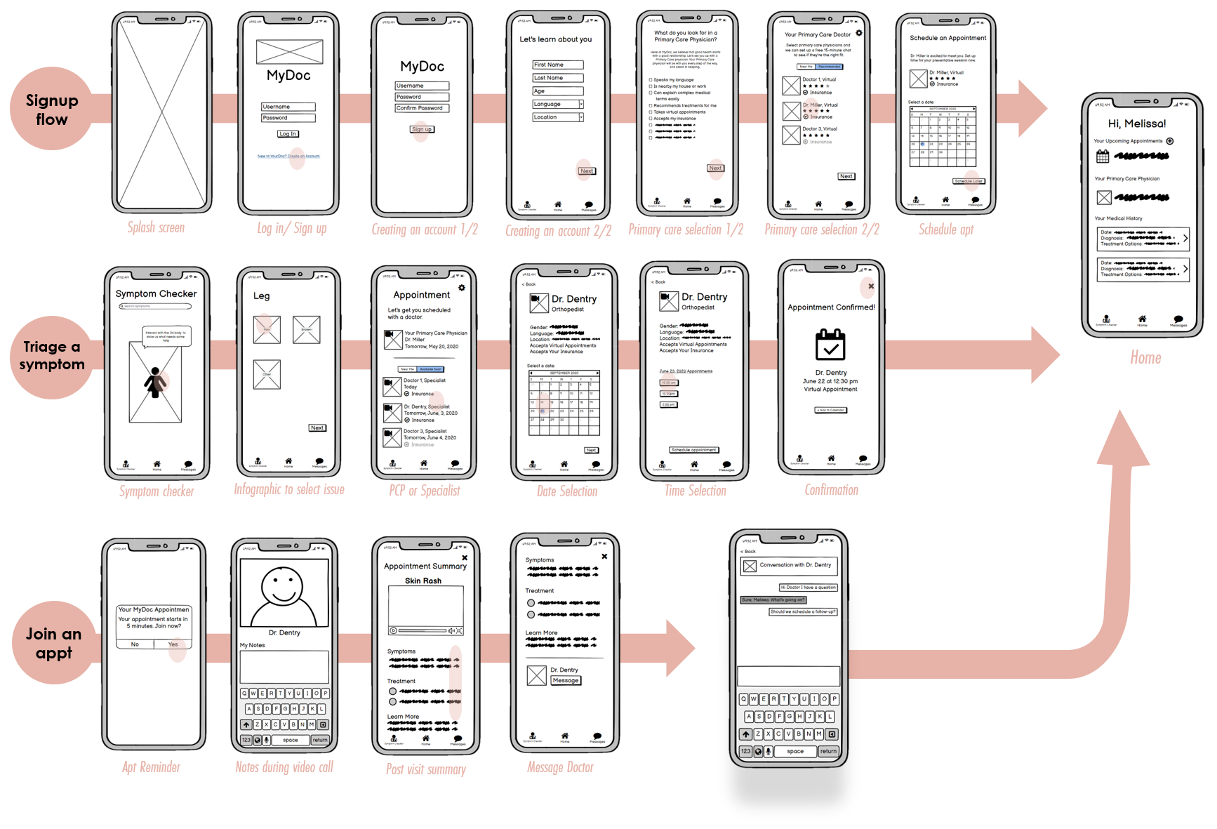 A few rounds of user flows lead to the key app pages: symptom search, doctor search, appointment scheduling, ability to join a virtual appointment, the post-appointment summary, and a message portal.