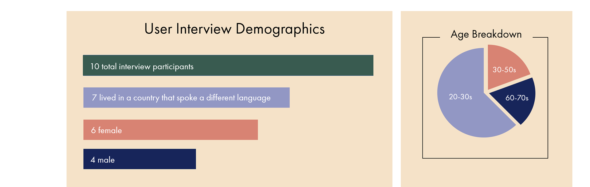 I recruited users who’ve faced language barriers firsthand: the majority of which have lived in a country that spoke a foreign language. My aim was to understand how they’ve conquered language barriers more complex than standard tourism experiences. To round out the group, I chose a variety of users of different ages and balanced out genders.
