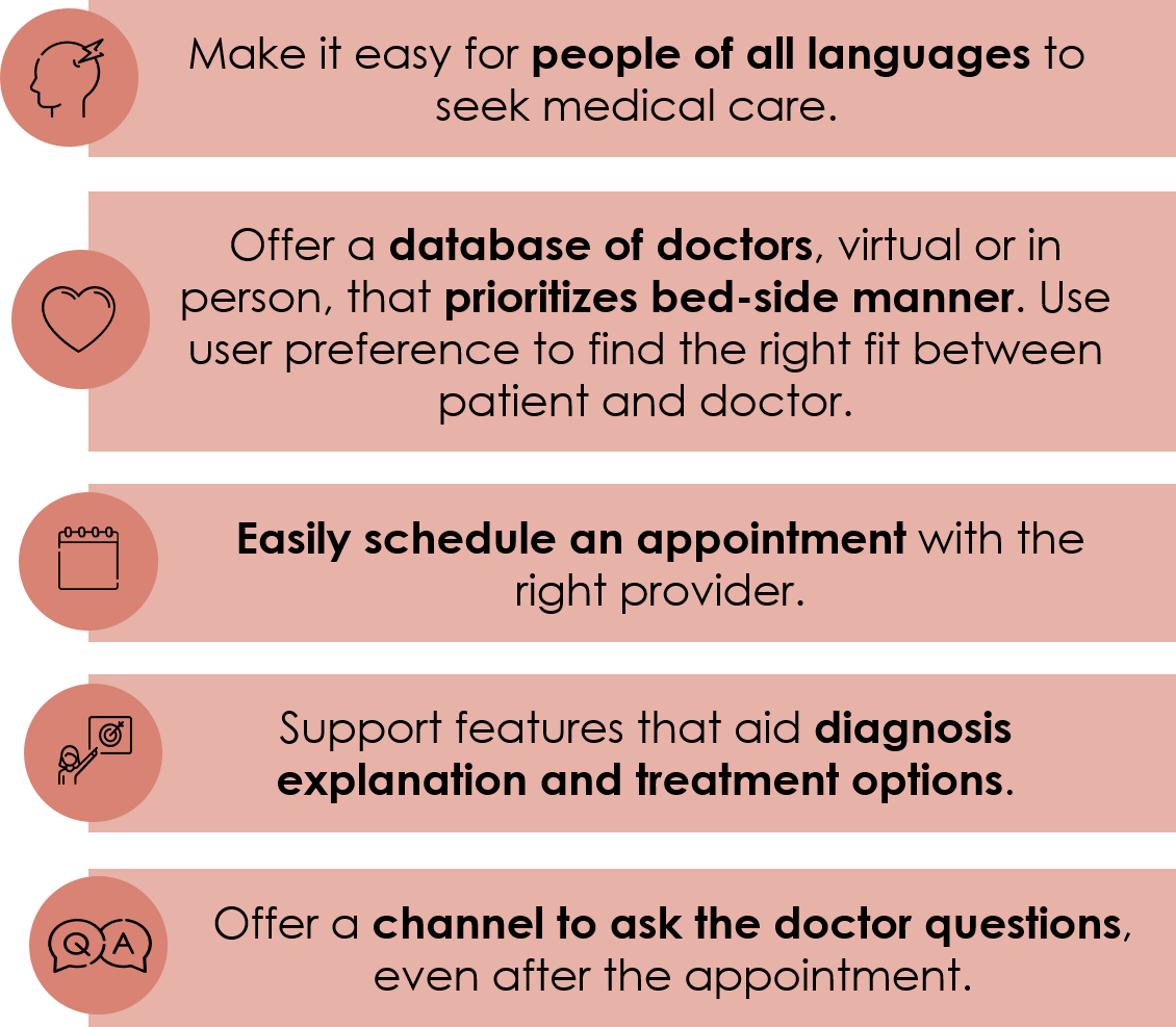 This got me thinking: what’s the difference between a patient who can’t seek care because of a language barrier, versus a patient who doesn’t seek care because of the fear of an understanding barrier? Can one solution solve both problems? Is a language barrier purely based on different languages, or could it also be based on lack of information or use of medical jargon?